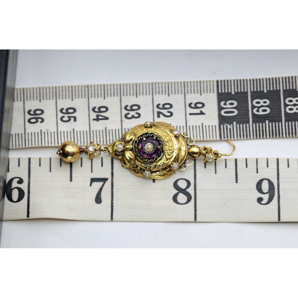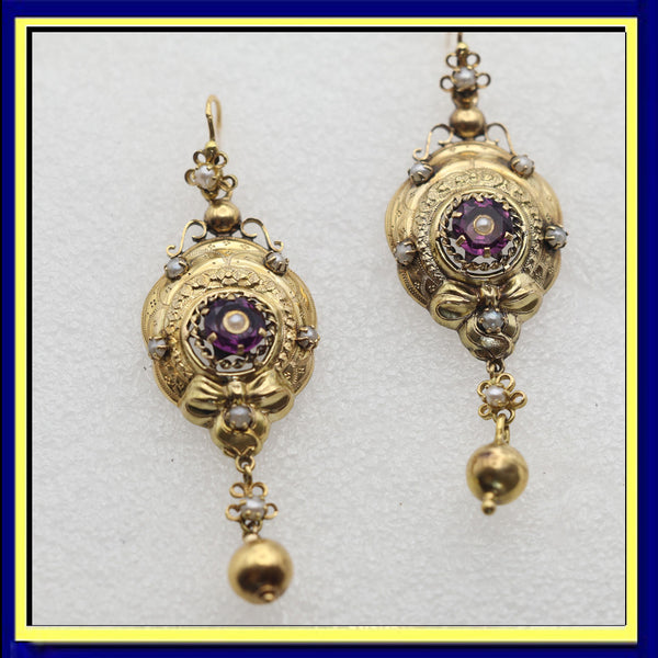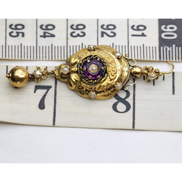 Antique Victorian Napoleon III earrings long ear pendants. 18k yellow gold, pearls, amethysts. Made in France, circa 1880.