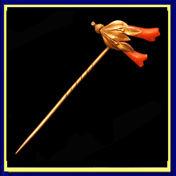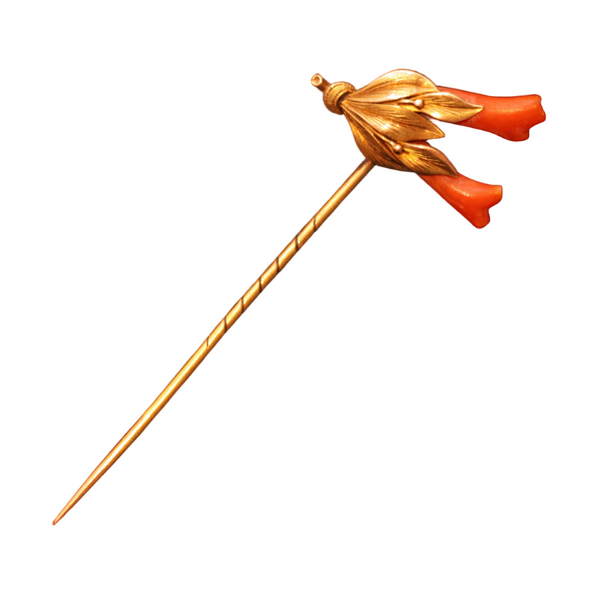 Description : Tie or stick pin with ridged surface to prevent slipping. The terminal or head is a naturally modelled sprig of foliage, berries and twigs made of gold and natural branch coral. The leaves are 'held' in a little ribbon at the tapered end. The coral twigs emerge from the wide, open side of the leaves. Fine modelling and detail of the foliage and little ribbon that catches the leaves at their end. Little berries are golden globules, almost too fine to be seen with the naked eye, but indicating the lengths artist-jewellers went to to make beautiful jewelry, even when it was understated. Beautiful orange colored coral.