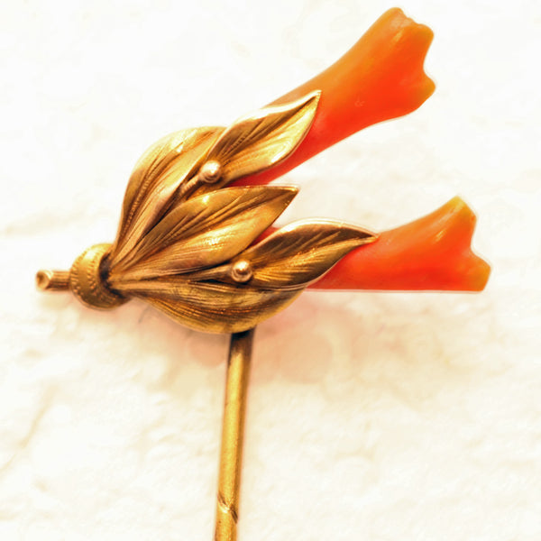 Antique Victorian stick pin, lapel pin or tie pin brooch. 14k yellow gold and natural coral. Made 19th century circa 1850 - 1870. Origin possibly Italian or English. Unisex - suitable for a man or a woman.