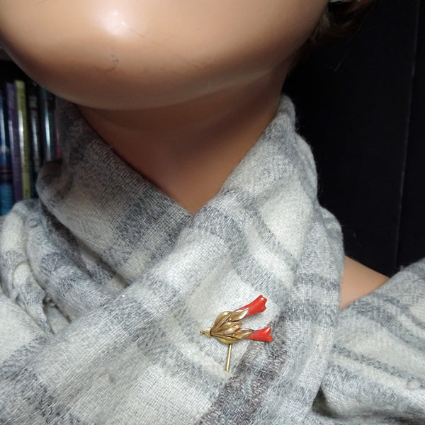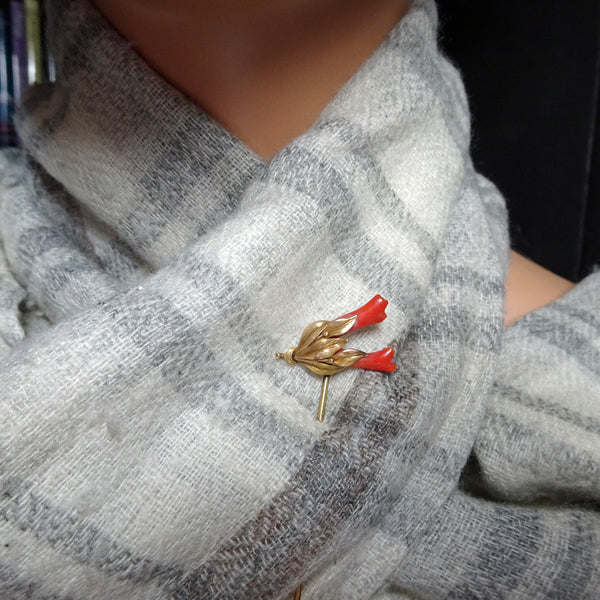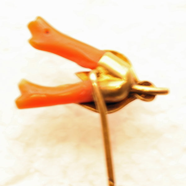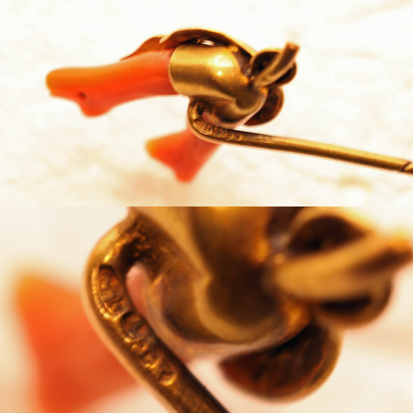 Marks and Metal: There are 3 partially legible hallmarks on the pin, near the end where it joins the coral and gold: an elongated mark (oval?) with what appears to be a star on the right of the oval; a round mark that is not legible; a mark with the letters J.K, presumably the maker.