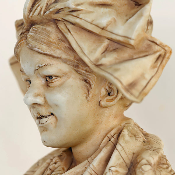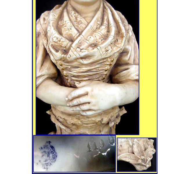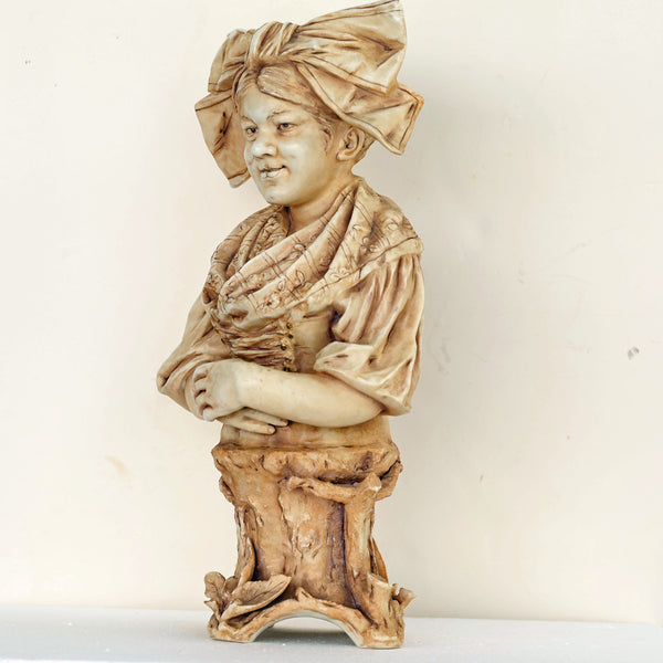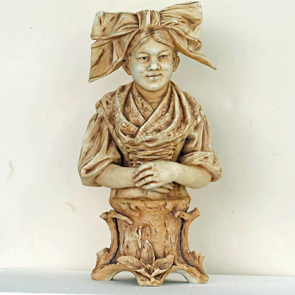 Sculpted model or figural bust of a young woman by Alfred Stellmacher (later RStK ). The girl wears Victorian dress, but manages to convey a distinctively oriental appearance, which reflects the style of Alfred Stellmacher. A huge bow in her hair. She wears a finely detailed dress. A naturalistic pedestal base, with applied flowers and berries in immitation of a tree trunk.