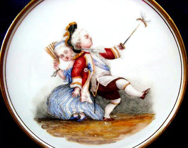 Depicts a little girl and boy, dressed in 18th century clothes, clearly very rich, at play.