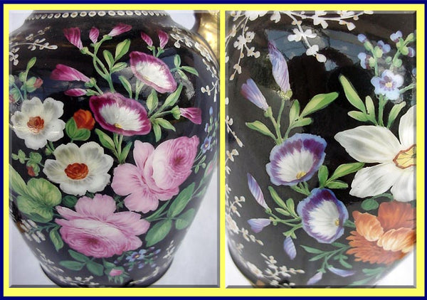 The biggest area of both front and back of each vase is handpainted with a magnificent floral still life.