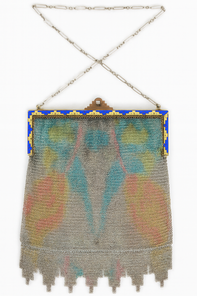 Antique mesh evening handbag or purse with enamelled frame. Made of very finely woven or knitted metal, dyed in autumn shades of soft turquoise blue, green, yellow, orange and tan. With a superficial glance the design looks abstract, but closer observation reveals a floral design with roses in orange and yellow and the blue - greens forming the foliage. Very Impressionist.  The delicate knitted metal is entirely flexible, resulting in a super-luxurious effect. Near the bottom is a border of round loops connected to a fringe in the same staggered geometric form as the design on the enamel frame and clasp. Pattern identical front and back.