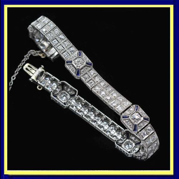 Diamonds, offset by platinum, each gem set in an individual square mount, with filigree border, connected by fine loops to it's neighbours. This allows the sections gentle movement. After every 7 pairs of diamonds, there is a square section composed of a central large diamond, accent sapphires at the corners and more diamonds in between. There are 5 of these square sections. The sides are beautifully chased with scrolling patterns. Workmanship and quality are excellent. A safety chain ensures the tongue-in-groove clasp is more than safe. Like most jewelry of this period, the accent stones (sapphires) are man made.