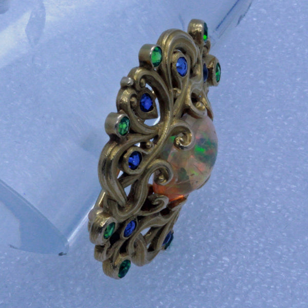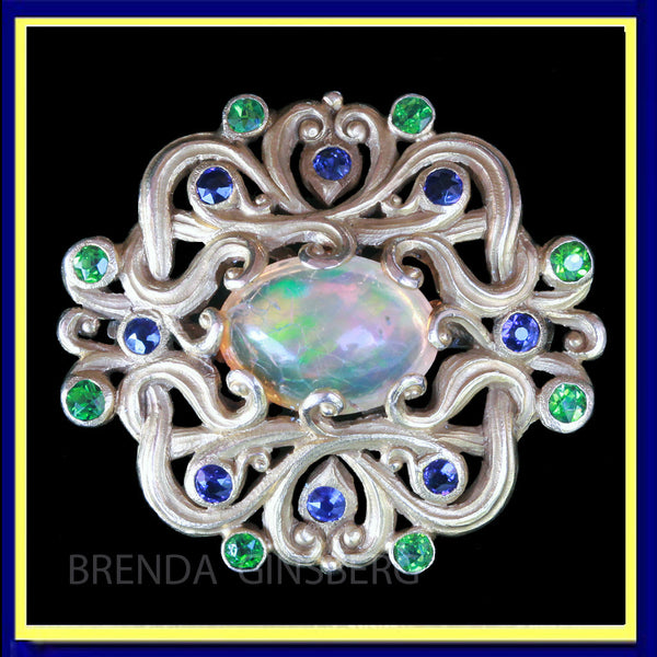 Description : A round shaped brooch composed of overlapping, intertwining fluted ribbons of gold that curl over and under one another. Set in the center with a beautiful cabochon opal, reflecting red, orange, green with a gorgeous glow of each tone, as the light catches different areas of the opal. The scrolling gold ribbons are set with bright green demantoid garnets and deep blue sapphires. This brooch uses many of the themes typical of the Art Nouveau and Arts & Crafts period. The overlapping scrolls with a somewhat Celtic look were very popular, the fashion being set in England by Ashbee and Liberty, but enthusiastically adopted by jewellers around the world. The fabulous peacock combination of bright green demantoid garnets with bright blue sapphires, was also very popular and is totally stunning. Finally, the love of opals in their various forms was a huge trend at the time and again, the contrast between the opal and it's bright colors, picked up and echoed by the other gems. Besides the other colors, this particular opal has a stunning display of green, as though the demantoid garnets have somehow been absorbed into the opal.