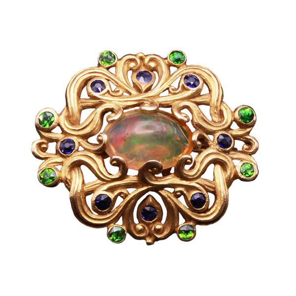 Antique Art Nouveau, late Victorian brooch. 14k gold, opal, demantoid garnet and sapphires. Made in the USA by Frank Walter Lawrence. Circa 1895-1910.