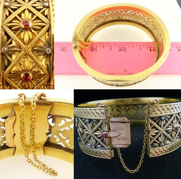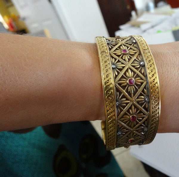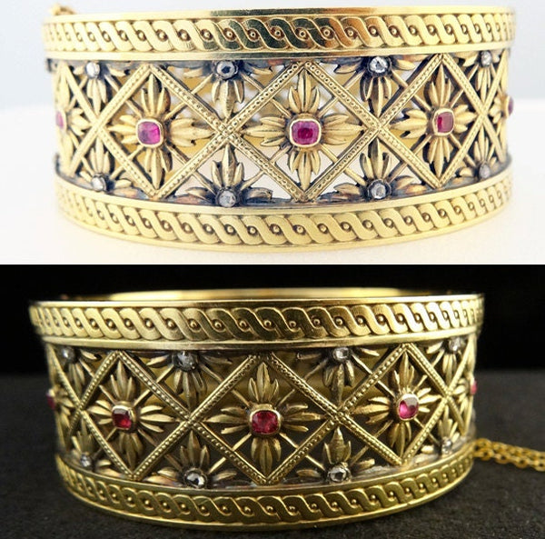 Wide cuff bangle bracelet. Outer, protruding borders are very solid and have a scrolling pattern in the Greek style. The wide band between the borders is openwork, gold. Solid, beaded diagonal lines form diamond shapes, within which are flowers, centered by rubies and diamonds. Gothic/Renaissance feel to the design, especially when viewed from the inside. A safety chain is original to the bracelet. Tongue in Groove clasp is sturdy and secure. It opens by pushing on the ruby near the clasp. Fine hinge is all but invisible on the other side. Outstanding workmanship and quality. True museum piece.