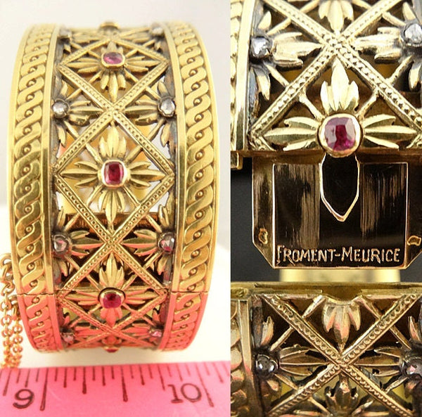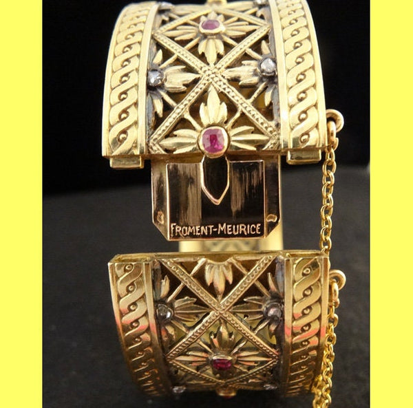 Condition: very good with negligible wear commensurate with age. Like his father, Emile Froment-Meurice was regarded as an undisputed master of the jewelry trade and his jewels regarded as works of art even in his time. Vever describes his settings as lighter, more delicate and with elegant forms and the designs more carefuly elaborated. Revivals were still popular. Bracelets were the predominant jewels of the Second Empire - worn on each arm, several together.