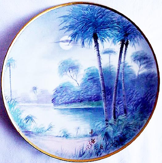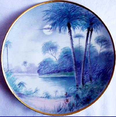 The gold rimmed round plate with a deep well in the middle is hand painted with a tropical waterscape scene of Palm trees over the water in the moonlight.