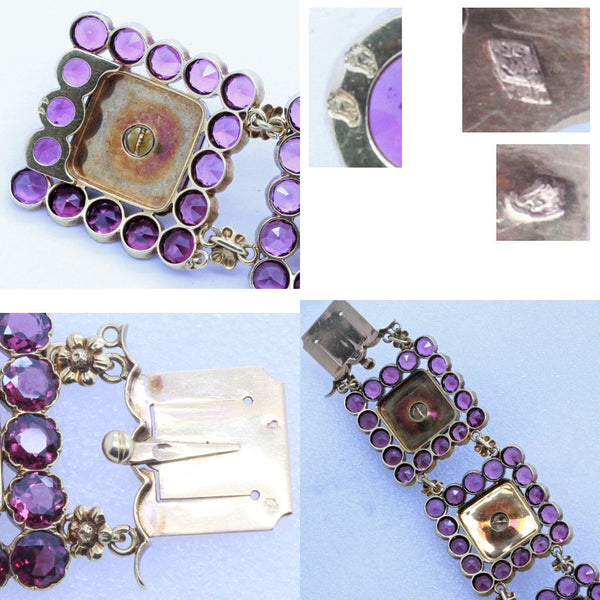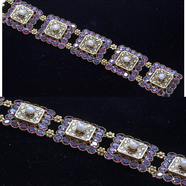 Description : A wide cuff bracelet. 5 square stations. Each station or section composed of an outer square border of bright pink almandine garnets. Deep glow and gleam of round gems, gently faceted, held in a flower-like collet setting. Inside the garnet border is a square of black-enamelled gold with engraved scrolls and foliage around a raised golden flower containing a central pearl. We strongly believe the pearls are natural as there were no cultured pearls at the time this bracelet was made. Each square is joined to its neighbours and / or the clasp via a flower modelled in gold and hidden gold loops. This allows for great flexibility. Wide tongue-in-groove clasp is very secure. A tiny pair of gold loops enable the addition of a gold chain that could add further security, but is not currently existant. Exquisite workmanship, design and materials. A truly luxurious bracelet.