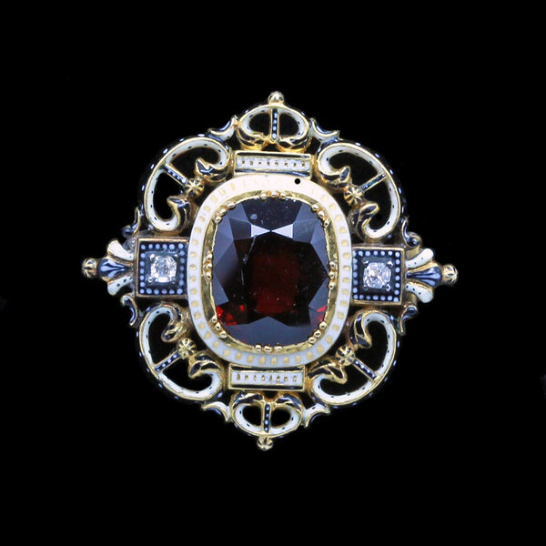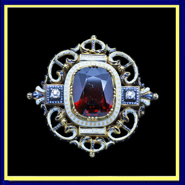 Description :Openwork, scrolls in an almost square shape. The center with a large, beautifully deep red garnet, gently faceted with a large, flat table. Held within a gold collette surrounded by a border of white enamel with gold pique dots. This in turn surrounded by the openwork gold scrolls, Rolling to shells and globes at the cardinal points and enamelled in black and white, which is almost a signature of Carlo Giuliano. On either side of the garnet, enclosed within black squares with white dots, are a pair of OMC (old mine cut) diamonds. Quality is superb. Lavish workmanship and unstinting artistic effort can be seen when we look at the back of the brooch and see the beauty of the work, which is no less detailed in the indented patterns on all surfaces. The center of the back with a glass-covered locket that could contain a minute portrait or more likely, a lock of hair. Clasp with secure catch. Carlo Giuliano was known for introducing Renaissance Revival and other Revival styles to England and for the fabulous quality of his workmanship. This brooch is a great example that will make a proud addition to any collection.