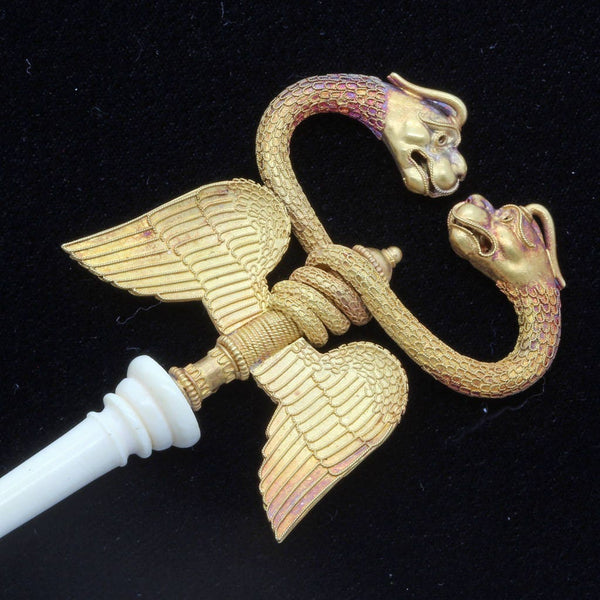 Description: Long pin with capitol, architectural top tapering to the opposite side and ending in a bud-like terminal. The top of the column is attached to a caduceus - symbol of doctors and medicyne taken from the Ancient Greeks. A pair of twisting serpents snake and coil around one another, entwined around a gold pillar and flanked by a pair of highly detailed wings. The heads of the serpents are dragons, fully sculpted in relief. Tremendous detail to the gold work. The snakes are slightly mobile. All surfaces are very richly embellished with rope-twist filigree of exquisite detail. Modelled dragon heads are superb. All of these symbols and details are part of what made the Castellani family so famous and their work so highly sought after even during their own times. The quality of the work is exceptional, the archaeological themes clearly echo the Ancient Greeks, Romans and Etruscans as does the naturalistic animal symbolism.