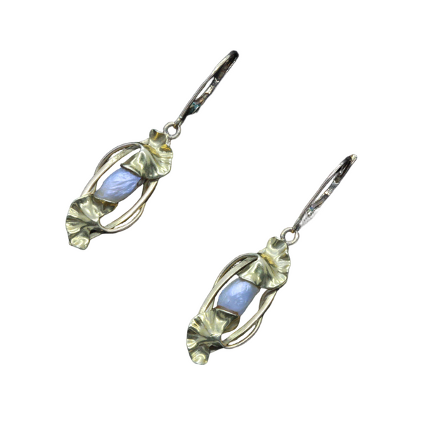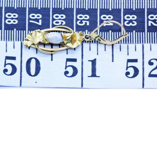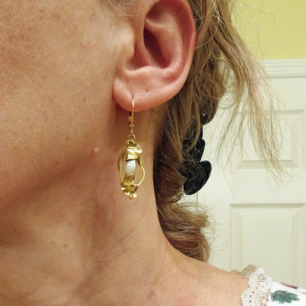 Description : Strong Art Nouveau / Arts & Crafts design. A pair of lotus or papyrus leaves, beautifully detailed and sculpted, fan around and embrace baroque pearls. The tendrils wrap around the pearls, overlapping one another as they each end in a fan-shaped, frilly leaf. The modelled detail is outstanding. Earrings are suspended from loops that allow them to swing and sway as the wearer moves. Wire backs are easy to insert and secure. Pearls have not been tested.