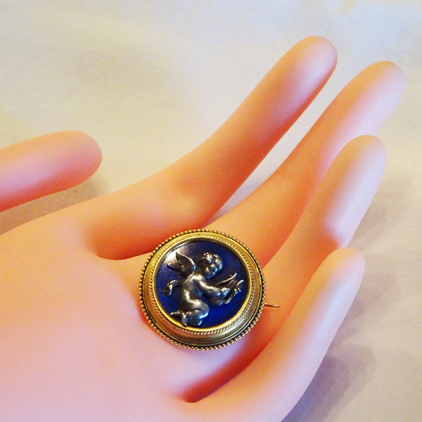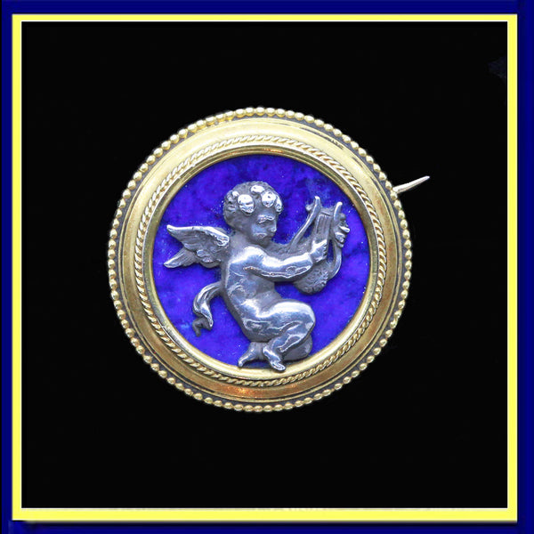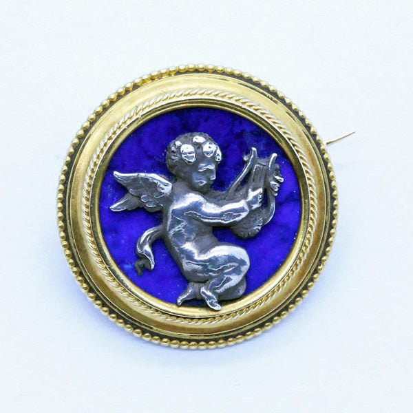 Description : Very striking round brooch. Design takes advantage of strong contrast between the colors: bright yellow gold border, inner disk of blue enamel and silver cherub, utilising the space of the enamelled reserve to the outmost. Beautifully modelled and detailed cherub floats in high silver relief above the blue ground, playing his lyre, one foot overlapping the center and gently falling over the gold border. Gold in high/lower relief in concentric circles alternating unadorned gold rings with ropetwist filigree and outer ring of gold beadwork. Quality is excellent and a good example reflecting the company's reputation of superb workmanship that won them prizes and acclaim during the 19th century.