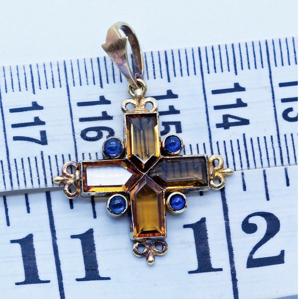 Antique Victorian Renaissance Revival cross pendant. 18k yellow gold, citrines and sapphires. Made in England, circa 1895 - 1914 by Carlo and Arthur Giuliano.