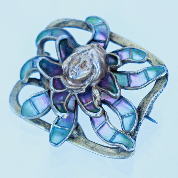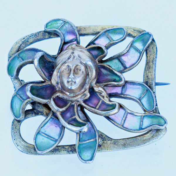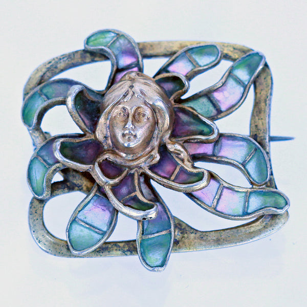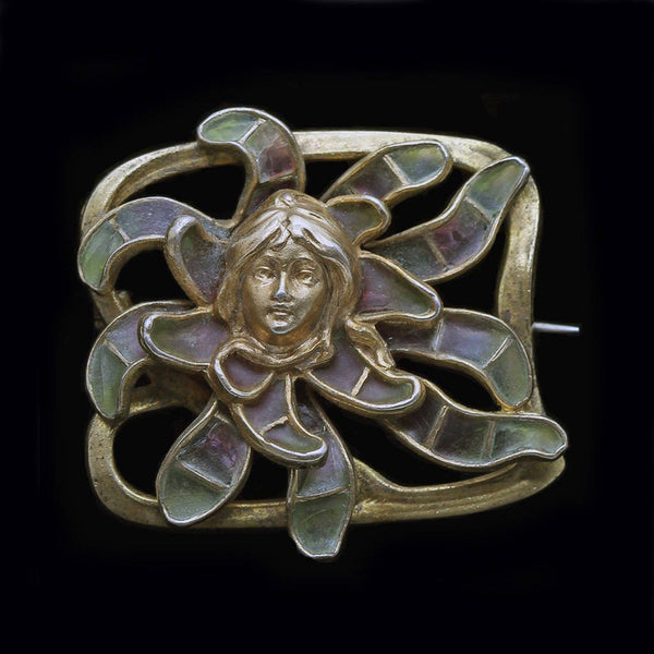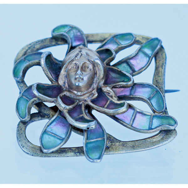 Description: Assymetric, organic, roughly rectangular in shape with elements of foliage overlapping the outer gilt silver border. Highly sculptural, the head of the woman and foliage are quite 3-dimentional. The brooch depicts a woman's head emerging from a swirling mass of foliage. Typical of the Art Nouveau / Jugendstil era, the beautiful face with long, wildly flowing locks of hair, dissolving into the background of leaves. Leaves with outer gilt-silver borders and plique-a-jour enamel in shades of green and pink. Exceptional for the beauty, elegance and fine workmanship. The subject is also highly sought after as it includes the most popular elements of the Art Nouveau period that appealed to the fine French and European aesthetic of the time.