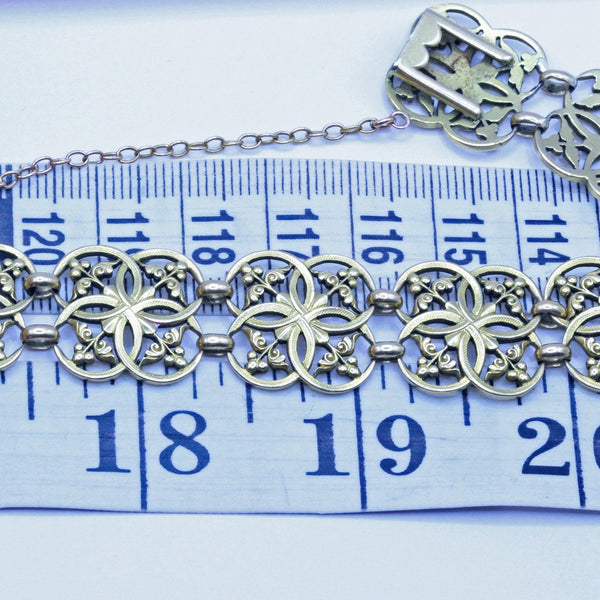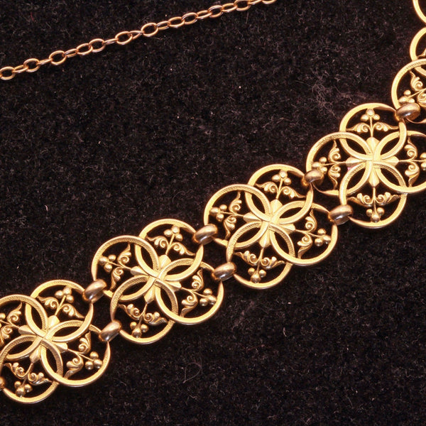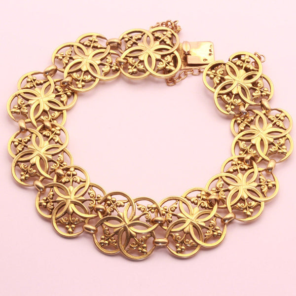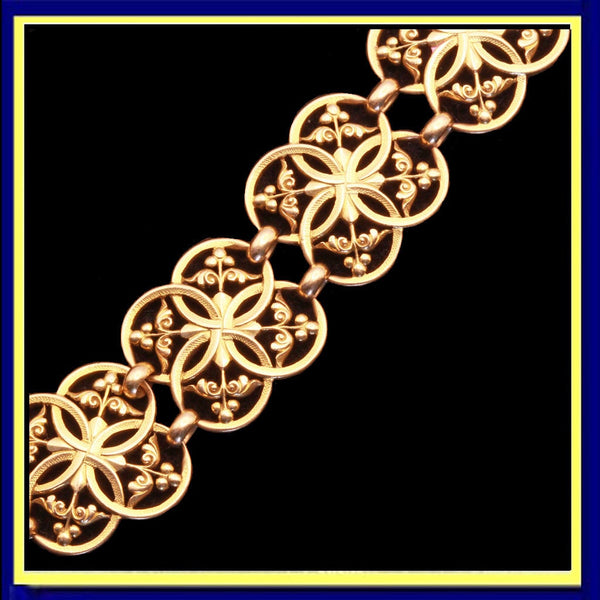 Description : Bracelet consists of 10 identical stations, connected via pairs of broad oval links. Each openwork station consists of overlapping circles with as much emphasis on the negative spaces as the gold. Area within the circles of gold with fine sword-like foliage and berries. Surface of circles is very finely textured.