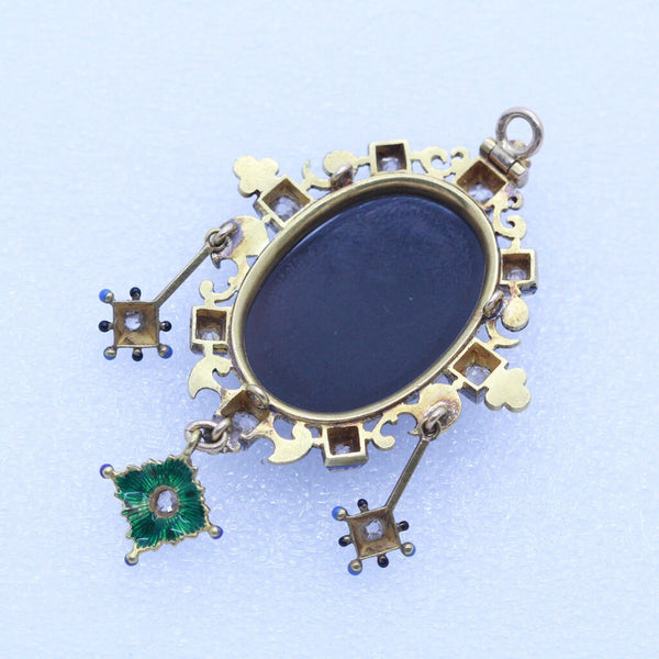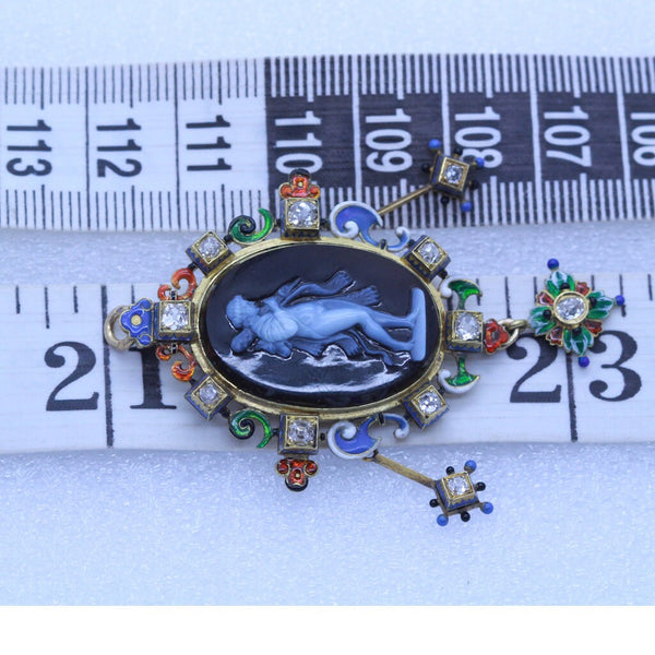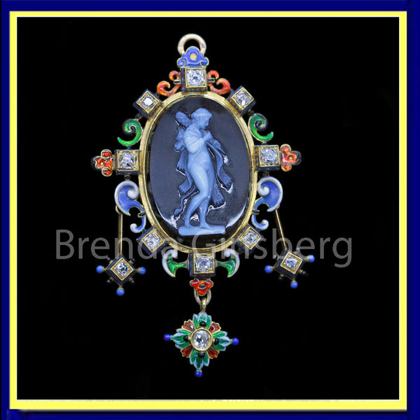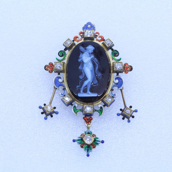 Measurements: Weight is 14.5 grams. 2 1/4 inches (6cm) long. Description : An oval cameo in a gold mount with rich enamelling and diamonds. Classic Roman Revival both in subject and workmanship. The cameo is superbly carved and depicts a young Hercules. He holds his famous club with which he stunned the Nemean Lion before he overcame it. The lion's head can be see behind his back and his sharp-clawed paws and pelt swing fore and aft. The cameo is carved from a dark brown and white hardstone agate. The details are exquisite - shown magnified in the pictures. The superb cameo is mounted in 18k gold with a bright and lively design in the Renaissance Revival taste popular at the time. Gold superbly enamelled in green, red, blue (royal and sky blue) and white in scrolls and beautiful swags of pale blue on gold on square buttresses, each collet set with a diamond. A pair of swinging, long gold rods suspended on either side of the oval pendant support similarly mounted diamonds with enamelled beading in blue and black around them. Finally, suspended from loops at the bottom is an enamelled scrolling square with botanic theme, set in the center with a diamond. These parts add movement to the pendant. The pendant has 3 loops. An upper bale on a hinge that can fold back when not in use. A pair of small gold loops on the sides, near the top which could be attached to a chain or ribbon. Our last picture of a famous Elizabethan Renaissance jewel, known is the Francis Drake jewel is shown to illustrate the influence of the Renaissance on the work of fantastic Revival craftsmen like Jules Wiese. Looking at the details, it could almost have been done by the same hand. Quality of this pendant is outstanding from the carved cameo to the fabulous design and enamelled workmanship.