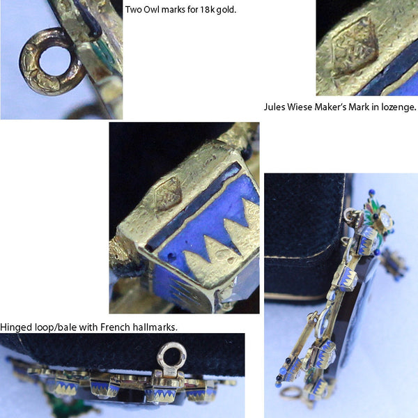 Marks and Metal: The loop on the right (when you are looking at the back of the pendant) has two French owl hallmarks for 18k gold. The bale/loop on top also has this mark and another illegible mark. A square base with a diamond on the lower right (when looking from the front, approximately 5 o'clock) has the Jules Wiese lozenge maker's mark. The back of the cameo has a scratched number 1148.5 which is most likely an inventory number of a previous owner.