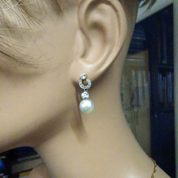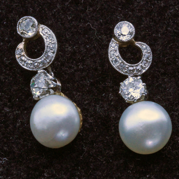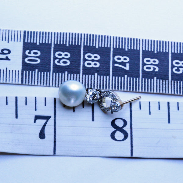 A pair of little loops connect to a larger diamond below the surmount. The loops allow the drop to swing and sway as the wearer moves. The diamond is joined to a natural pearl. Lovely gleam and glow to both pearls and diamonds.