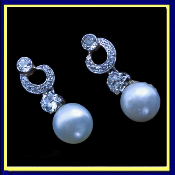 Antique Edwardian Belle Epoque earrings dangle ear pendants. Platinum over yellow gold, natural pearls and diamonds. Made circa 1910's.