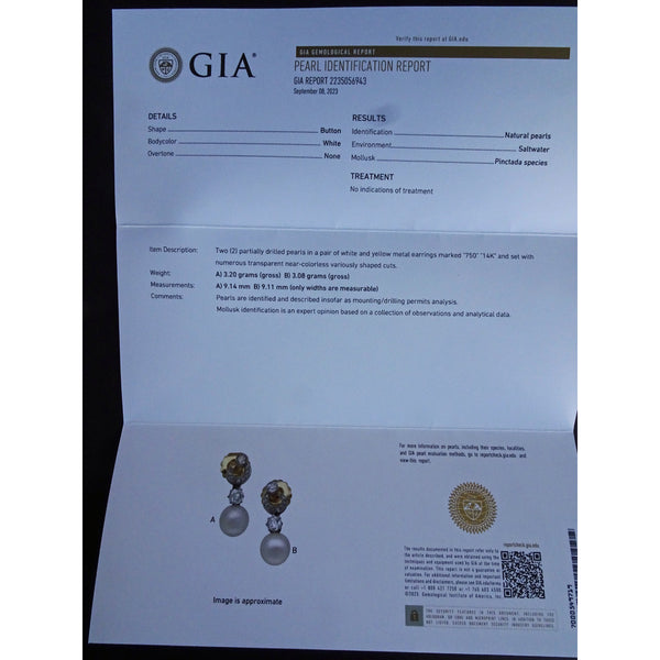 Measurements: Weight is 6.2 grams. Approximately 7/8 inch (2.5cm) long. GIA certificate for pearls state that they are 9.14mm and 9.11mm respectively. See 'photo of GIA report.