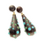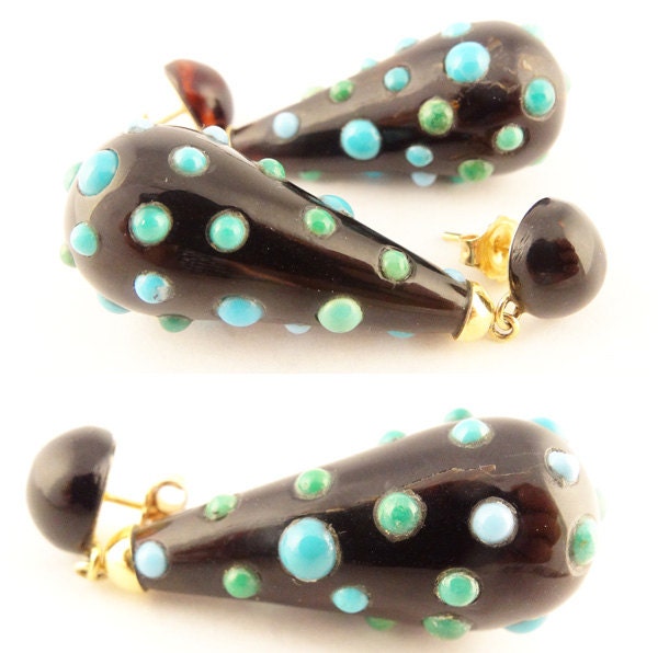 Ear studs w butterflies at the back for pierced ears. The carved 'natural material' forms a half globe surmount, backed in gold. A couple of gold loops suspend a pear shaped drop, the neck enclosed in gold. The surface is studded with cabochon natural Persian turquoise. Blue shading to green where the turquoise has changed color over the last century. Stunning, to say the very least and beautifully made.