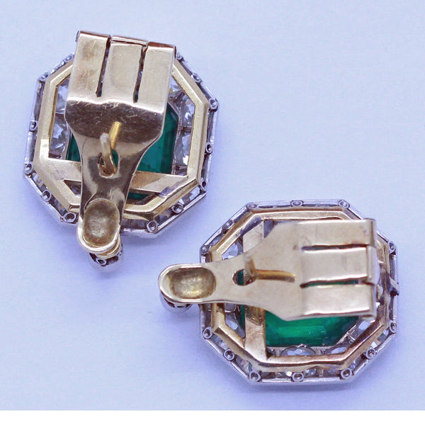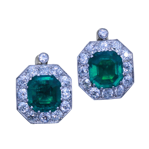 Description : A pair of emerald cut, square emeralds with canted corners. Emeralds of a superb color and depth. Set with a border of Old European cut diamonds and suspended from small diamond surmounts. Mounted in platinum over gold. The clips are certainly later additions that help support the earrings comfortably on the ear. Made for pierced ears.