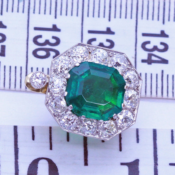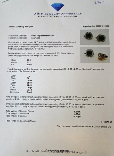 Measurements: Weight is 9.30 grams. 4.60 ct diamonds; 8.87 ct emeralds.