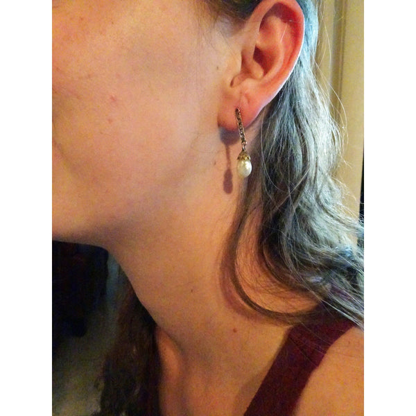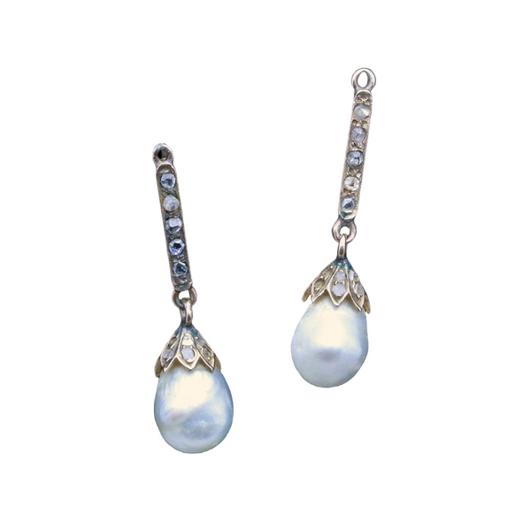 Description : Elegant, simple lines. The earrings consist of a line of rosecut diamonds from which loops suspend diamond and pearl drops. The loops allow the drops to swing and sway as the wearer moves. Pearls are enclosed in calyxes, like buds of flowers. These mounts are finely set with rose cut diamonds. The pearls are a full, roundish oval. The upper surface has a lovely silvery white color. Backs are slightly more golden in hue. The pearls have a GIA certificate that states that there is no indication of treatment. In the past, the earrings would have been suspended from a detachable post or wire. The previous owner had 14k gold posts attached instead.