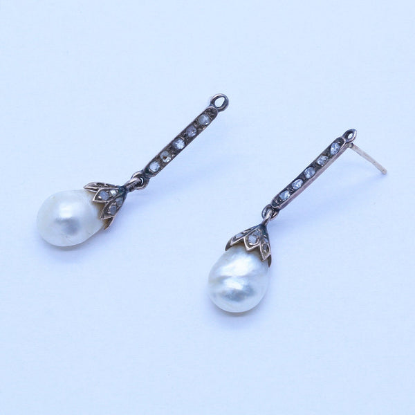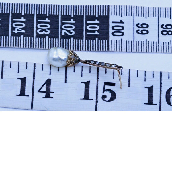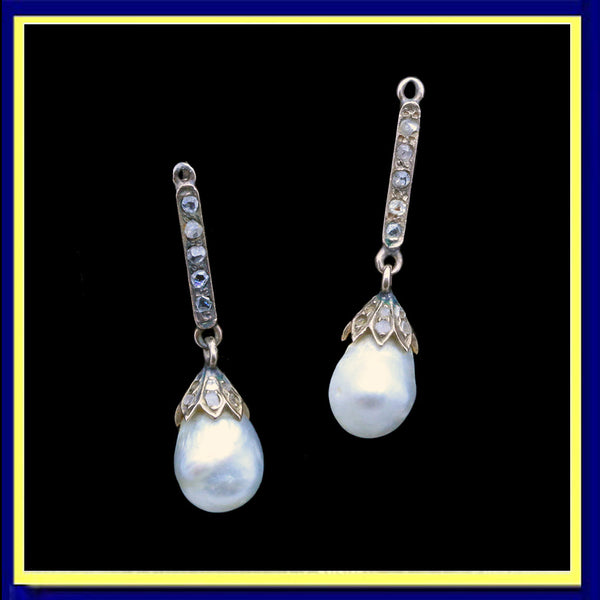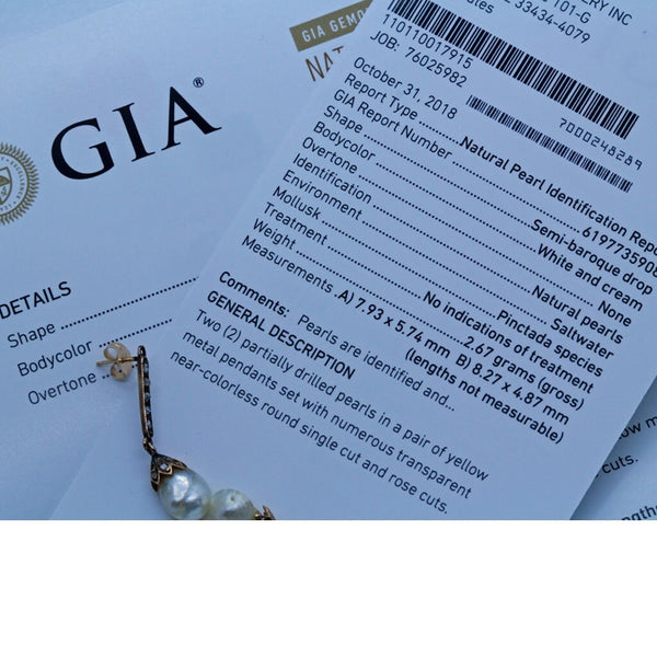 Antique earrings / ear pendants. Natural saltwater pearls, rose cut diamonds, 14k gold. Date to late 19th or very early 20th century. (Victorian - Edwardian era). Come with Gia Certificate.