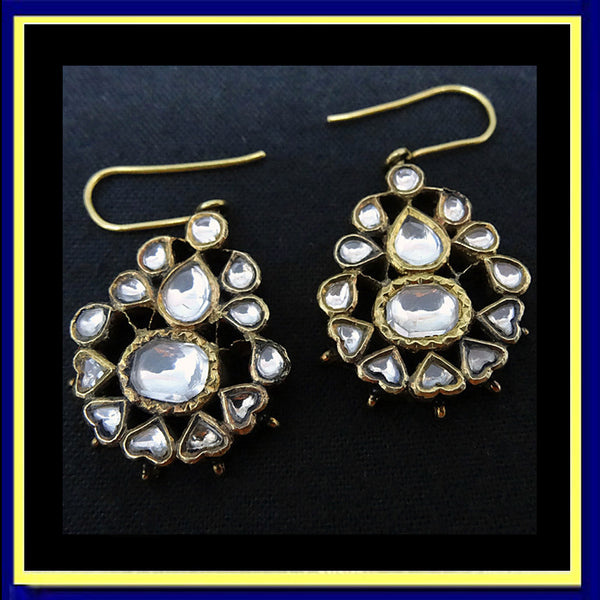 Chandelier drops made of wonderfully transparent foiled white sapphires that look like diamonds. Flat cut in old India style. Kundan set in gold mounts, the central one of which has engraved border decoration. The smaller surrounding diamonds are heart and leaf shaped. There are 5 tiny loops that look like gold globes from some of the sections. Perhaps they once held dangling elements. Today they serve to give a nice, finished look to the earrings. Modern wires have been attached to the earrings for ease of inserting into the ears and comfort of wearing them. The look is stunning - suitable for the most luxurious occasion.