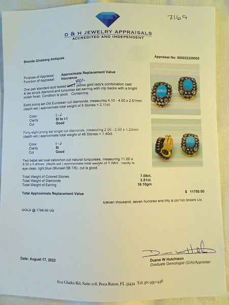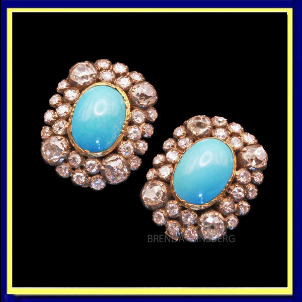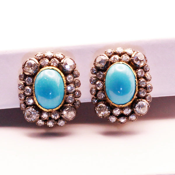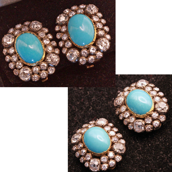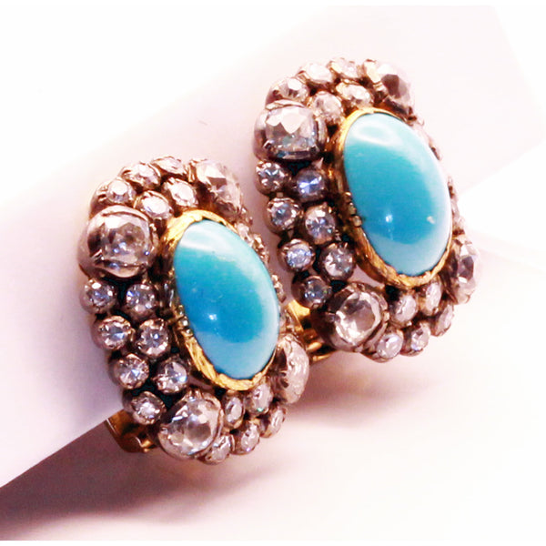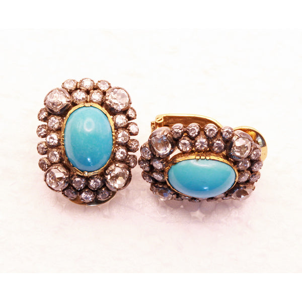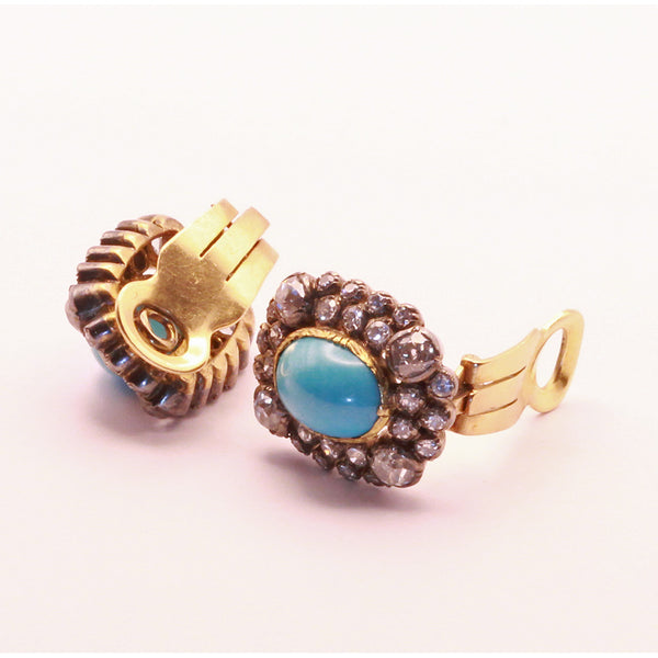 Antique late Victorian earrings / ear clips. 18k gold (see below), diamonds and natural turquoise. Origin not known.