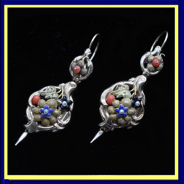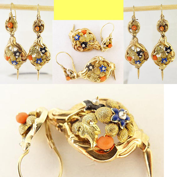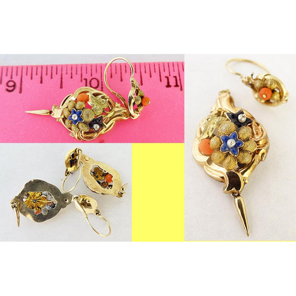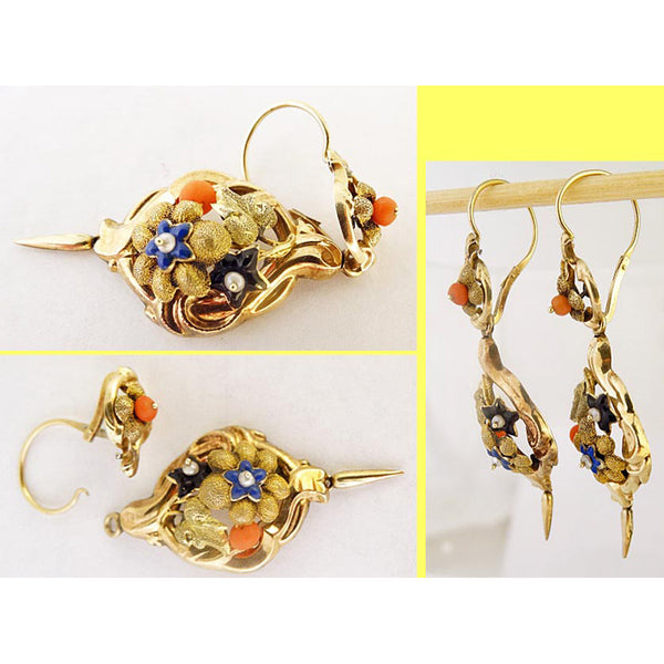 Antique Victorian day night earrings / long ear pendants. 14k gold, enamel, coral and pearls. Made circa 1840-60. Origin unknown.