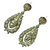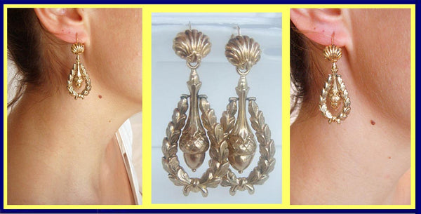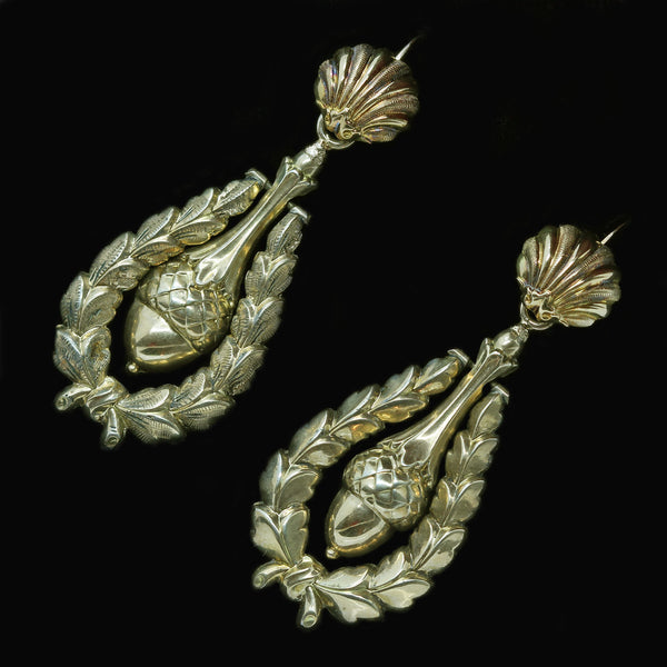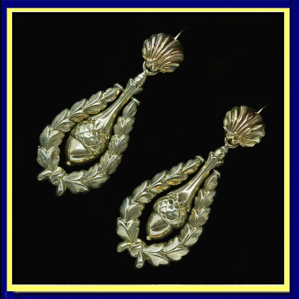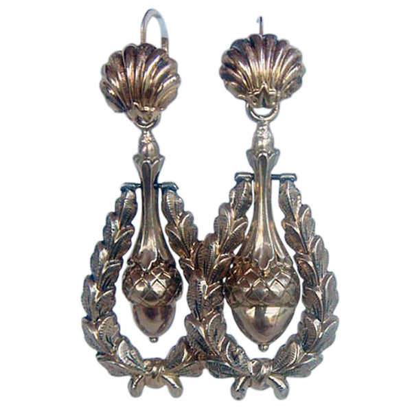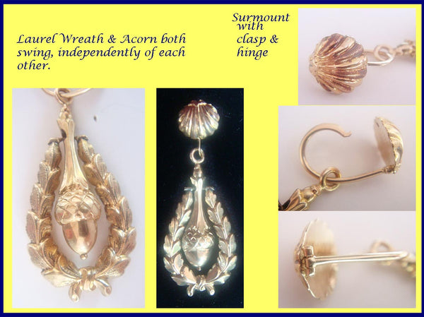 Description: Earrings consist of two main parts: an upper surmount in a fan shell shape that suspends a loop above a long, pear-shaped wreath of laurel leaves with bows at the bottom and long acorn drops. An interesting fine detail is the acorn-like join of the drop to the loop. Foliage enhanced by fine engraved detail. The acorns are articulated and swing independently of the foliage frame, which also moves along with the wearer. Light catches the gold from different angles and adds subtly to the attraction of these beautiful earrings. The small surmounts can be worn alone by day if a simpler look is desired and with the wonderful drops to attract a little more attention. (hence day/night term).