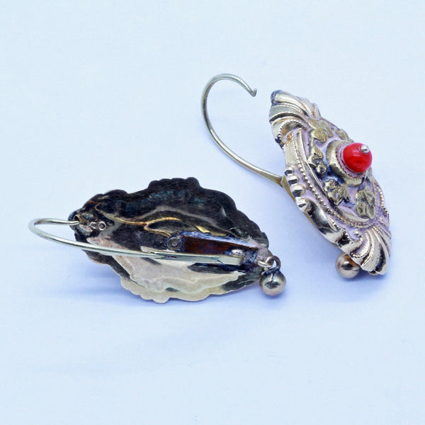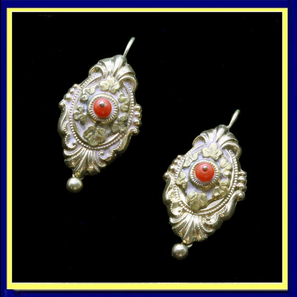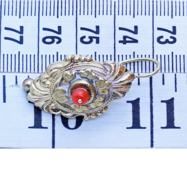 Description : Oval in shape with extended or protruding decoration adding to the interest. The gold is repousse hammered to form a design of leaves and scrolls, fans and granulation. In the center of each earring is a small coral bead attached by a gold pin to the earring. A little golden globe is suspended at the bottom of each earring. Backs are closed.