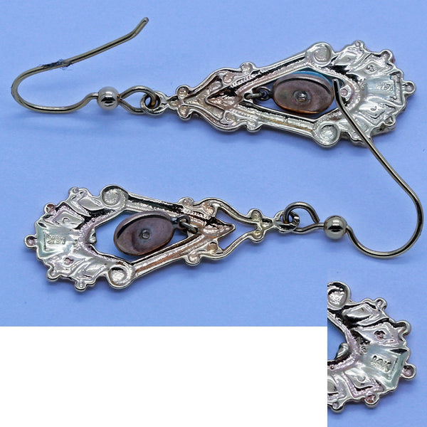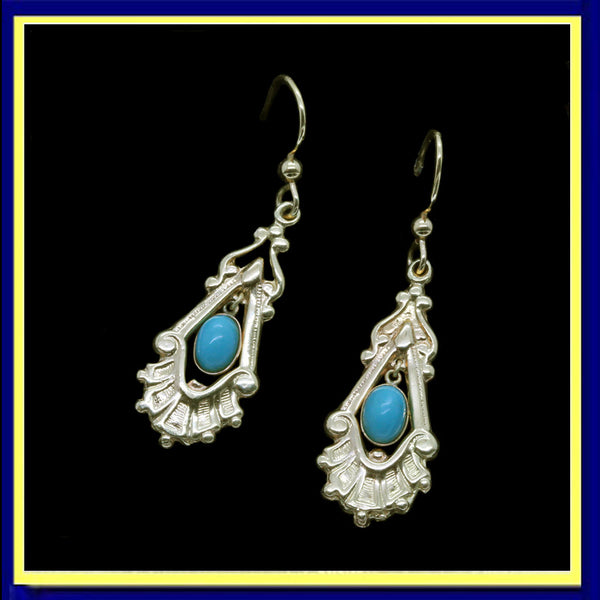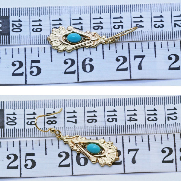 Description : A gold bead surmounts the earring on top. It connects to a pair of loops followed by a flaring, scrolling harp shape, from which an elongated kite-shape in gold forms the openwork frame of the main body of the earring. The bottom part of this section is wide and round with modelled pleating and folds, each section terminating in a little golden globule. Within, loops suspend an oval turquoise in a collette setting that swings and sways as the wearer moves, attracting the eye and adding to the interest of the design. Simple gold wires are easy to insert and comfortable to wear. Look great and suitable to wear with any outfit.