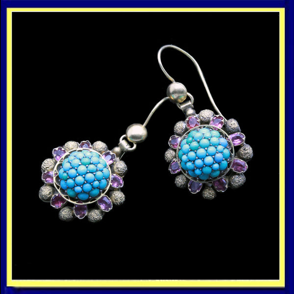 Description : Perfect every day earrings that you can wear and forget to ever take off. Flower forms, with globe centers composed of cabochon natural turquoise, surrounded by a band of gold and then an openwork ring of alternating gold beads and oval garnets, set in gold collettes. Little golden balls with textured surfaces, immitating filigree of the Classic Revival taste. Wires are easy to insert and very comfortable to wear.