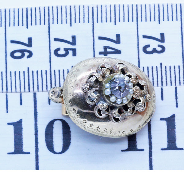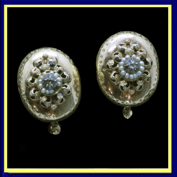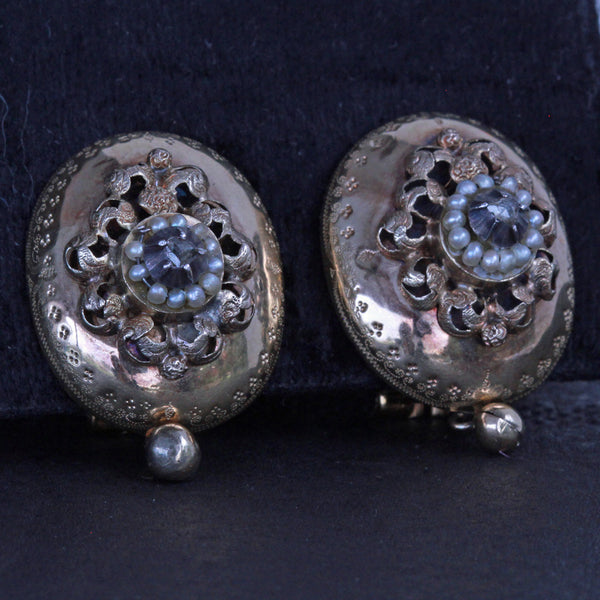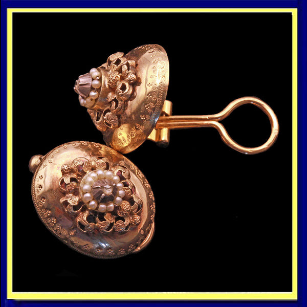 Description : Earrings in the form of domed ovals. The outer gold border is exquisitely engraved with bright cut engraving of a fine quality. A concentric band of gold modelled as overlapping, sculptural stylised flowers encloses an inner circle at the apex of the dome which consists of a border of tiny fine natural pearls and within a high silver mount holding a rose cut diamond.