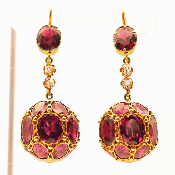 Antique Victorian dangle earrings ear pendants. 14k gold, garnets and diamonds. Made circa 1840-80's in England, UK. Measurements: Weight is 13.4 grams. Length 1 1/2 inches (4cm) not including the wires. Description : Exceptional and unique pair of earrings. Convenient gold wires connect to a surmount, upper section, composed of a luscious pinky-purple/purply-pink garnet held in a gold collet with patterned edges. The surmount connects via small gold loops to a line of diamonds that have totally independent movement and allow the globes at the bottom to swing and sway as the wearer moves. The movement catches a viewer's eye and causes light to reflect at different angles from the gems, adding to movement and interest. The drops are utterly fabulous: Orbs composed of gold and garnets. The pink-purple color distinguishing Rhodolite garnets. These gems glow pink to deep purple, depending on how the light catches them. Very royal and distinguished by association with the purple color of high aristocracy in previous centuries and very fun as today's women sees pinks and purples. Orbs have long been associated with sovereignty.The garnets are beautifully offset by fine gold workmanship with collettes holding them, connected by an openwork lattice of tiny golden globules. The globes are composed of concentric rings of garnets, rounded and tapering at the terminals with concentric rings of gold at the bottom. The orbs are fully in the round - unlike most early jewelry that was flat at the back. Workmanship and design are exceptional. Earrings combine subtle aristocratic symbolism with the fun and fashion of movement. Marks and Metal: No marks, as is to be expected of jewelry from this period. Gold was electronically tested to ensure metal purity. Condition: Good with negligible wear commensurate with age. Please see enlarged pictures and don't hesitate to ask questions which we will do our best to answer.