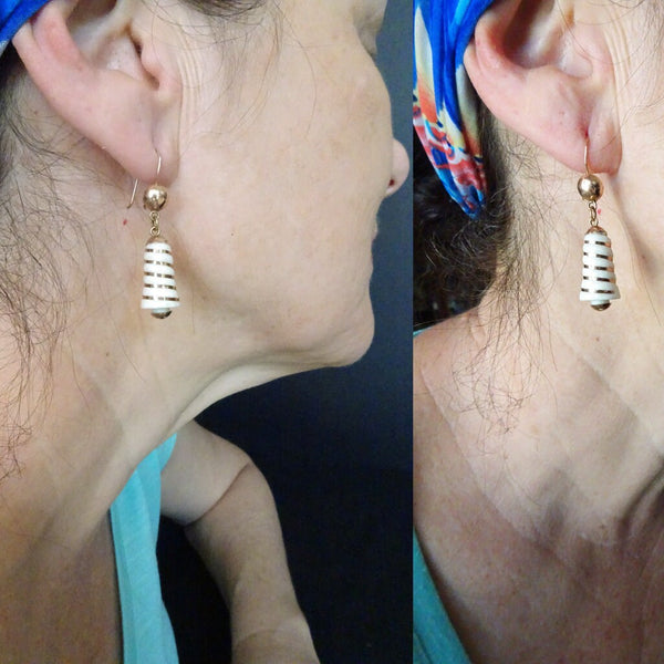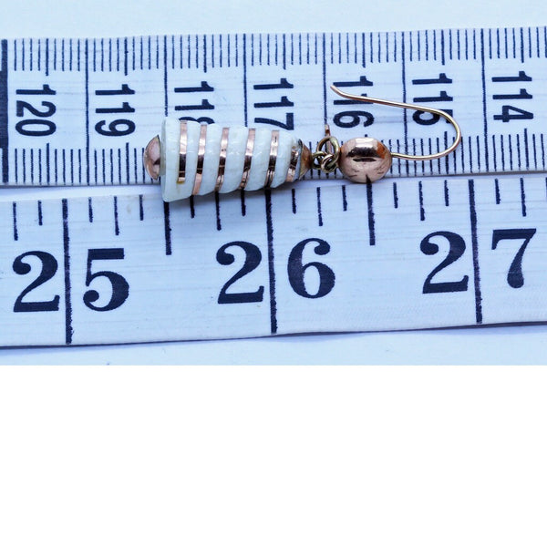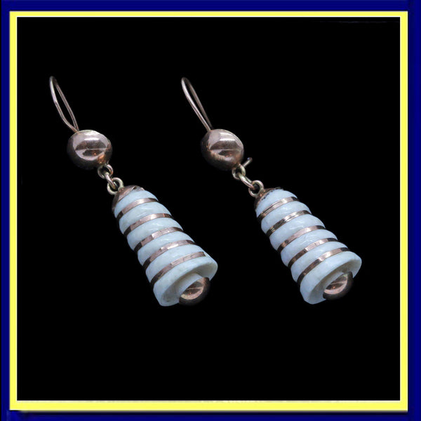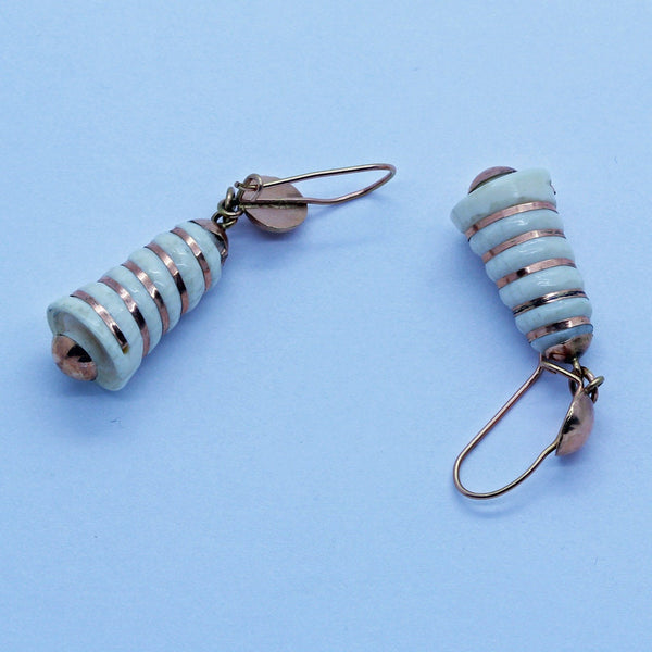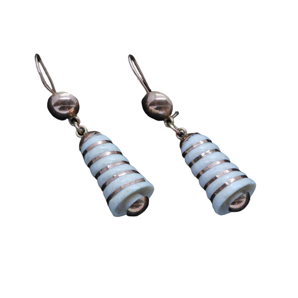Description : Surmounts in the form of half globes made of red gold suspend the main body of the earrings via small gold loops which allow the earrings to swing and sway as the wearer moves. The main body of the earrings are elongated bell-shaped, tapering gently towards the top. The flaring cylinders of white are entwined with ribbons of red gold. A half globe in gold is fitted on the bottoms, elegantly finish off the bell illusion and matching the form of the surmounts. Wires of yellow gold are possibly replacements. Easy to insert into ears and very comfortable to wear, the c-clasp is an added security measure. As good-looking today as they were well over 100 years ago.