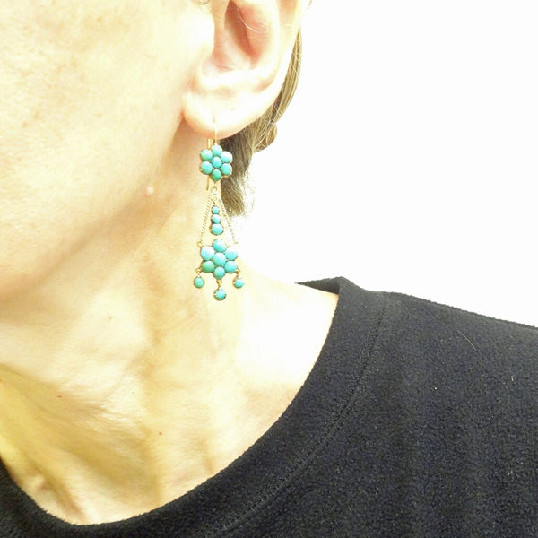 Surmounts in form of flowers entirely composed of cabochon turquoise gems. A loop suspends 3 components - forking twisted wires forming an inverted 'v' surrounding a drop of gradated turquoise cabochons and suspending another turquoise flower, larger than the one above. The bottom 3 'petals' of the flower suspend cabochon turquoise drops. All parts move independently of each other, drawing the eye and catching attention as the wearer moves. Simple gold wires make it easy to insert the earrings and comfortable to wear. Like many Victorian earrings, they are relatively light for their size, so they do not pull on the earlobe. Solid, English, Victorian workmanship with a wonderful combination of turquoise and gold that suits every complexion. The elongated design of the earrings adds to their elegance and beauty.
