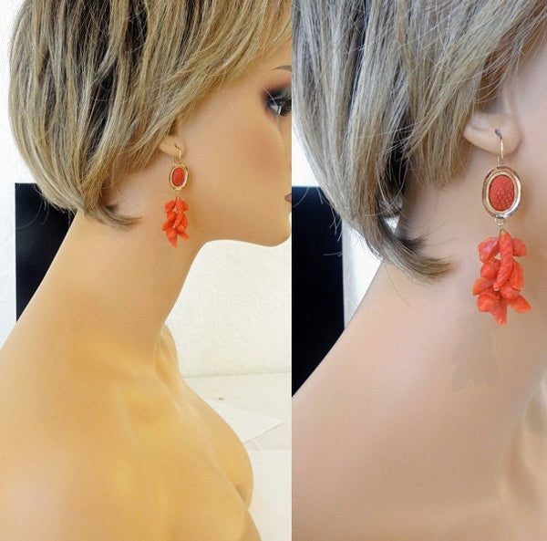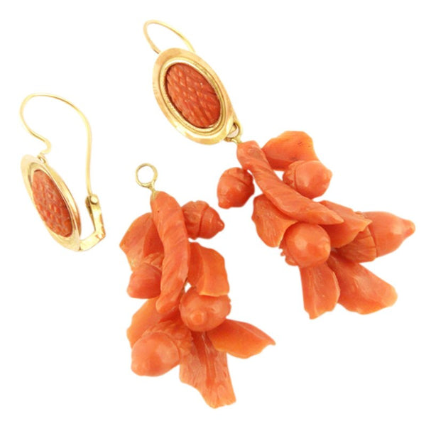 Antique Victorian earrings / ear pendants. Gold, natural carved coral. Day Night / Top Drop. Made 19th century, Italy.