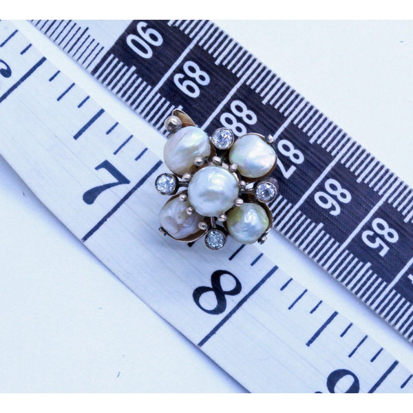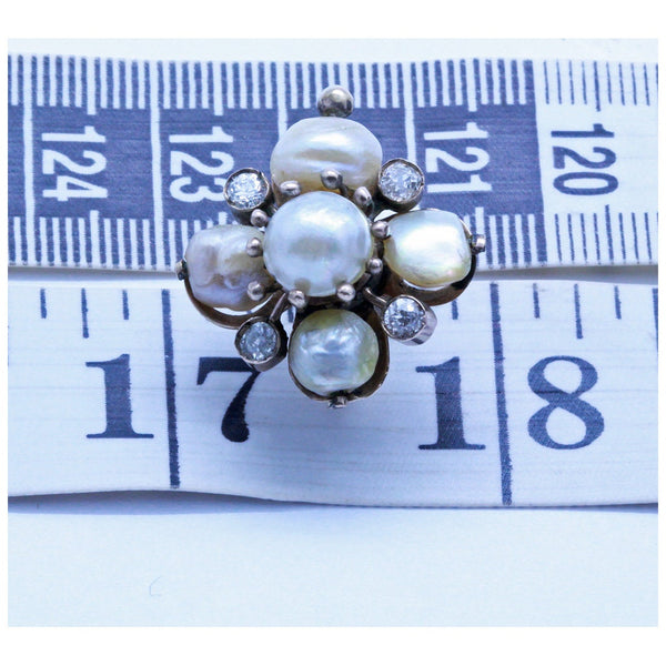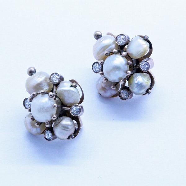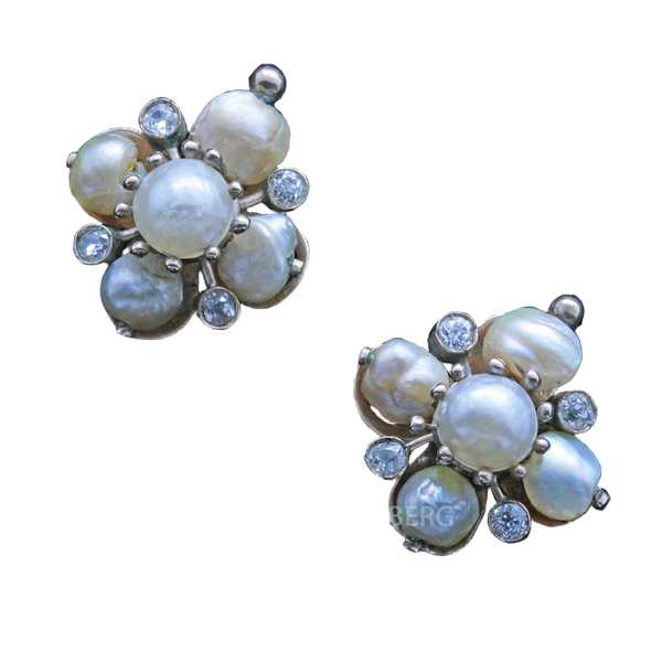 Description : An impressive pair of earrings consisting of 5 pearls - a central slightly larger round pearl with another 4 pearls radiating to the cardinal points. Between the pearls are colette-set diamonds. Central pearl held in a mount with gold claws in ending in gold globules, much in immitation of a flower. The outer pearls are held by a gold stalk ending in a similar golden globule. Looking from the sides of the pearls, through the drill holes, we see the thickness of the nacre, so it is almost certain that these are natural pearls (no signs of inner beads), but they have not been tested as such. Posts with sturdy clasps are very likely later replacements. Earrings are very luxurious looking and clearly come from a wealthy home. As wearable today as they were well over 100 years ago and just as stunning.