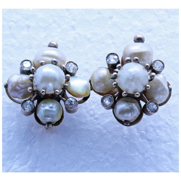 Antique Victorian earrings. 12k gold, Old Mine Cut diamonds, pearls. Made in Italy, 19th century.