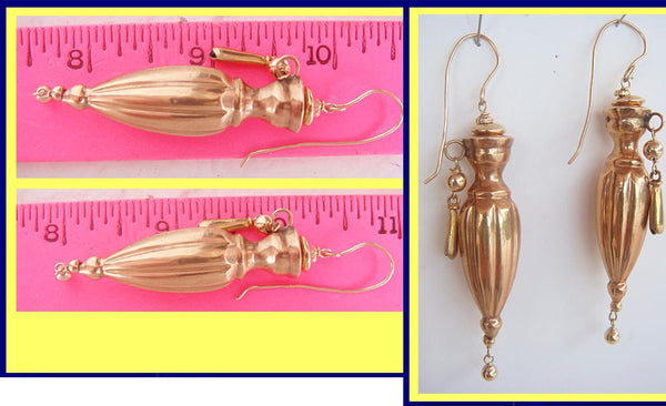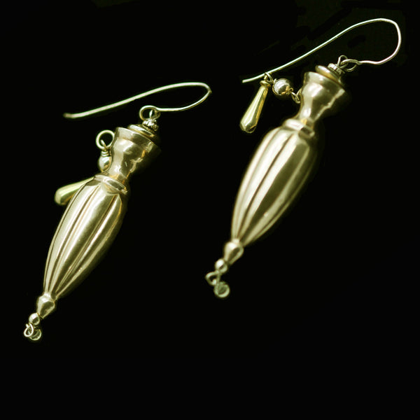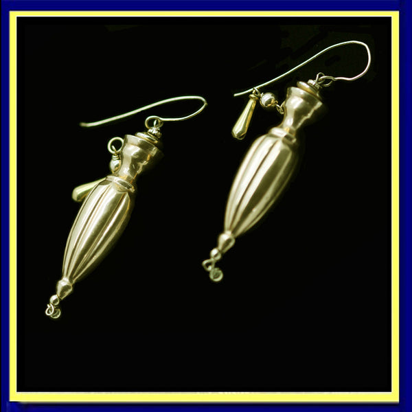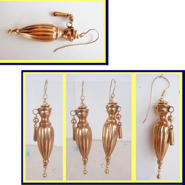 Description: Stunning long, urn / amphora shapes, suspending a golden globe from a pair of loops at the bottom - allowing them to swing freely as the wearer moves. A loop at the top, where the handle would join an urn, suspends another globe and a long tear-shaped drop. <P><P>