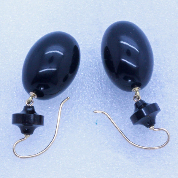 Description : Black earrings, assumed to be made originally as mourning jewelry. Strong shapes and design pre-date the Art Deco period by at least 50 years. Surmounts like spinning tops -a horizontal band with conical sides above and below. A pair of small gold loops connect the surmounts to the oval drops. The loops allow the drops to swing and sway as the wearer moves. The drops are a very full oval, with black onyx shining like a mirror and reflecting light at every turn, which adds interest and catches the eye. Ostensibly austere, the earrings are full of interest, movement and diversity. The design may be 150 years old, but it suits today's sensibilities perfectly. Understated, yet complex. Perfect to wear with every outfit for a young hipster to an elegant grandmamma, they are highly flattering and suitable. Simple gold wires, easy to insert and comfortable to wear are most likely replacements.