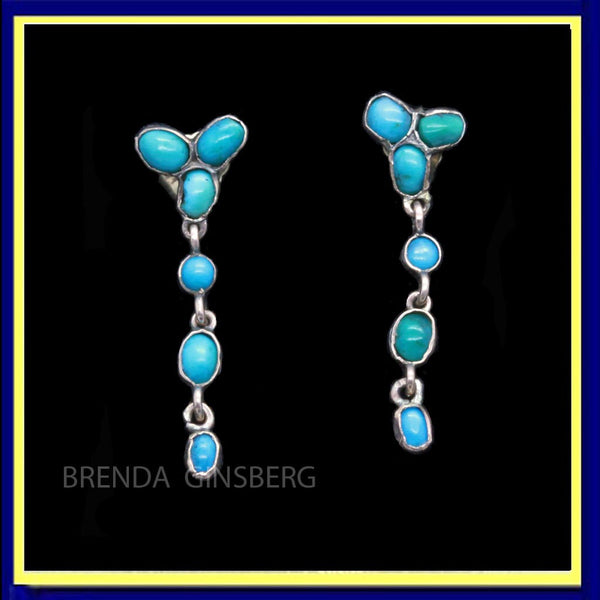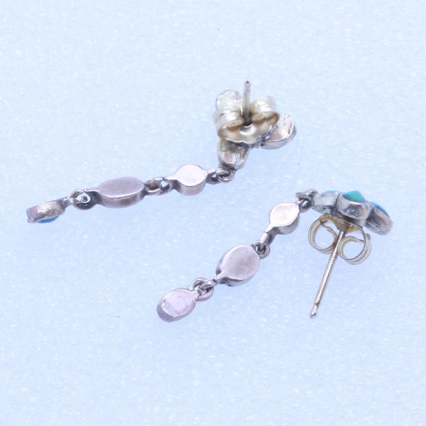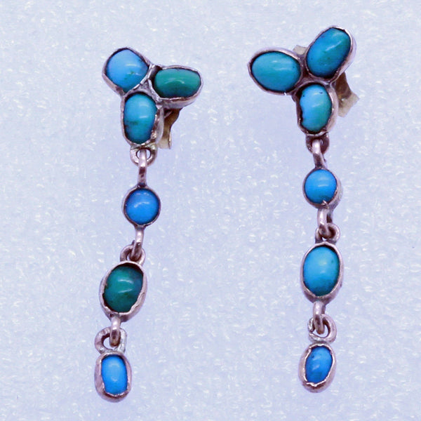 Description : Small, light, long - very delicate turquoise and gold ear pendants that dangle delicately from the ear lobe. Consisting of oval cabochon turquoise combined into little flowers and 'buds' that drop below, all colette-set in gold. Great eye-catchers as they swing and sway with every movement of the wearer. Light weight makes earrings very comfortable to wear as they will not pull on your earlobes. They are also suitable for a young girl. Wires were replaced with posts.