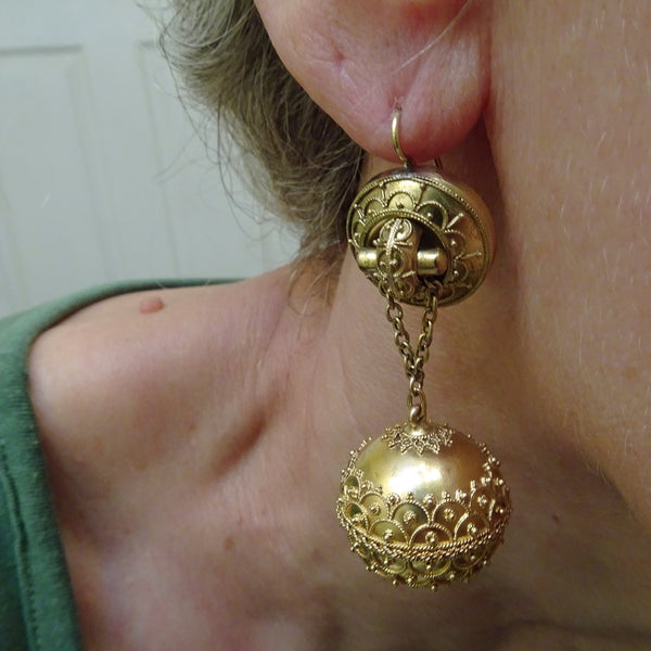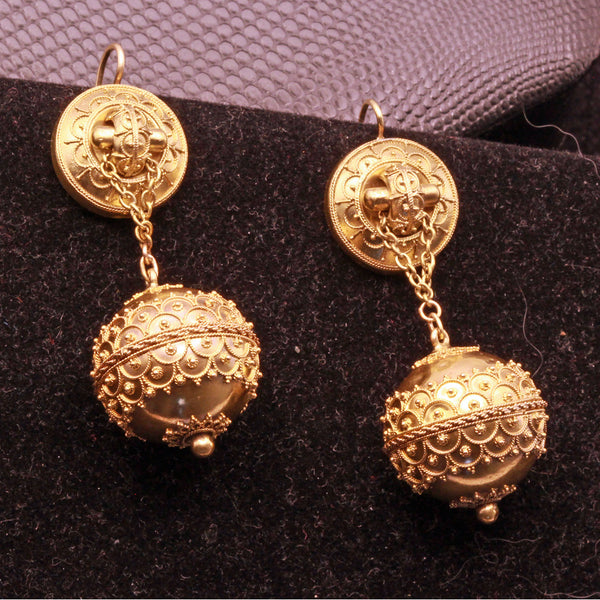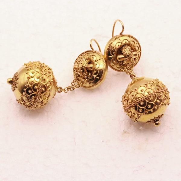The globe drops are magnificently adorned with tiny Etruscan workmanship, like the surmounts above - forming lacy patterns around a broad band of the circumference. The bottom terminals have applied globulated beadwork forming a complex star-shape